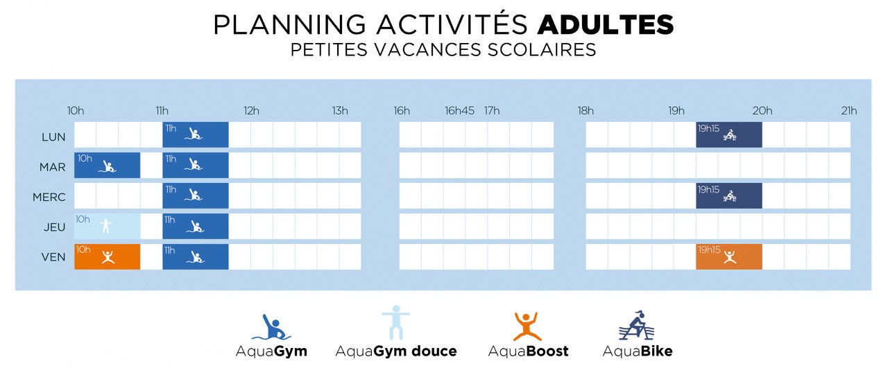 PLANNING ACTIVITÉS ACTIVITÉS ADULTES AQUAFITNESS AQUAGYM DOUCE AQUAGYM AQUA BOOST CIRCUIT TRAINING AQUABIKE COURS DE NATATION AQUAPHOBIE APPRENTISSAGE PERFECTIONNEMENT NATATION SPORTIVE ACTIVITÉS ENFANTS BB & CIE CIRCUIT KID AQUASAFE ACADÉMIE DES KIDS CAP ROUGE CAP SPORT CAP ADO